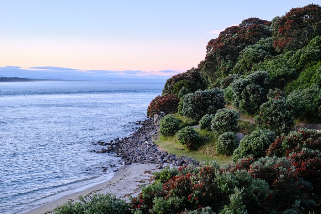 Our alarm was set for 4:45am. The sky was already turning pink as we set off on our assent of Mount Mauganui, also known as Mauao. Mike had discovered a professional photographer who recommended several of the places we will be visiting during this trip. She said that the sunrise at Mount Mauganui is one of the easiest hikes to one of the most spectacular views in all of New Zealand. We have to agree.