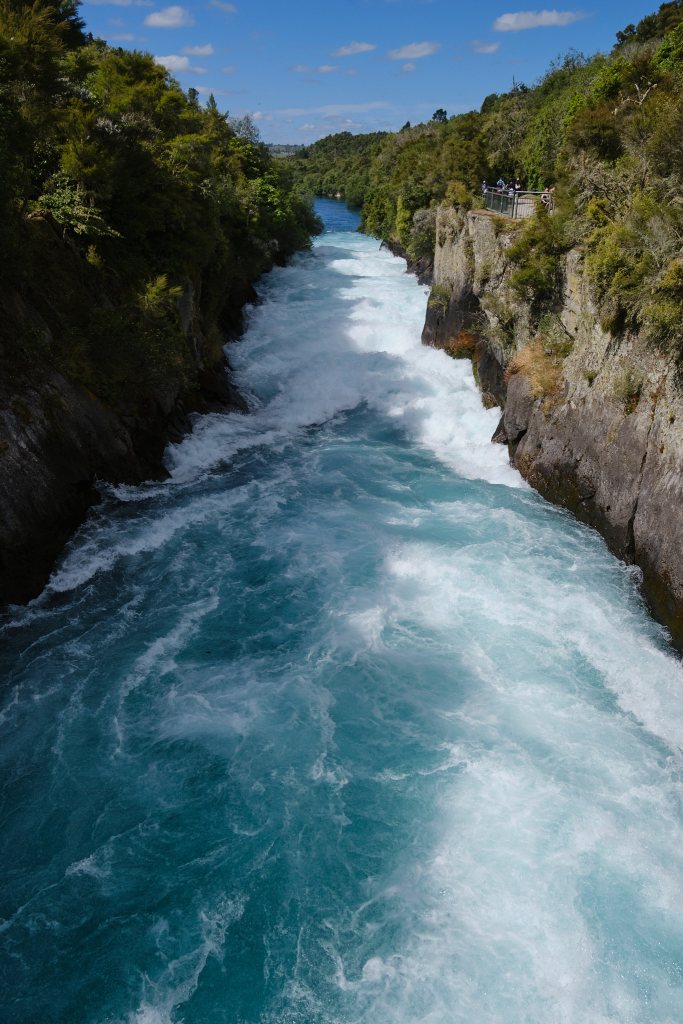 We should have thought more about that name. Driving down a dirt road to a gravel parking area, we stopped and spoke to some Americans. They assured us that the water was warm, and just down the path. The mother’s name was Gala. They had also just been to Hobbiton and were also headed to Tongiro tomorrow, as we were. They were going on a Lord of the Rings tour to celebrate their son’s high school graduation (what a gift!). Well, the water was hot, but the smell was absolutely nauseating! After a quick soak for my still aching feet we headed to one of NZ’s most popular natural wonders: Huka Falls.