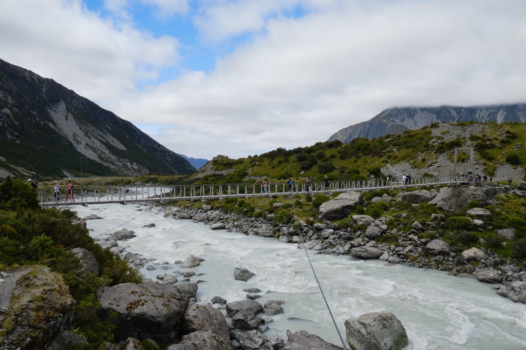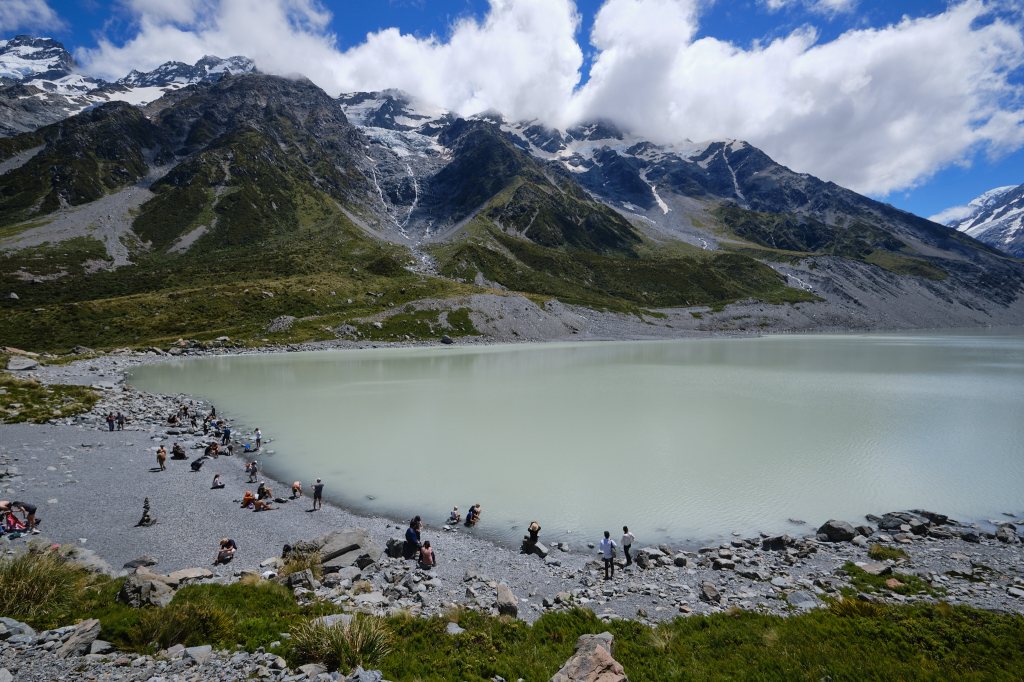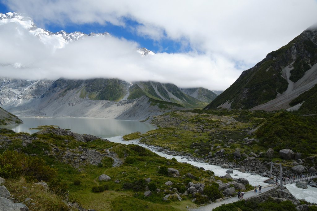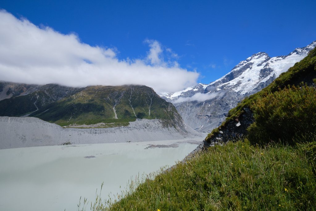 The clouds started to lift revealing what we thought was Mount Cook. Although the trail itself is very well maintained and easy to follow, there isn’t a lot of information about the natural surroundings. No maps and nothing to tell you how far you’ve gone and how much further it is to your destination (both Tongariro and Able Tasman were extremely well marked this way). Later, our new friend Maia told us that the DOC has everything online to print out. But for the moment, we just followed the crowd.