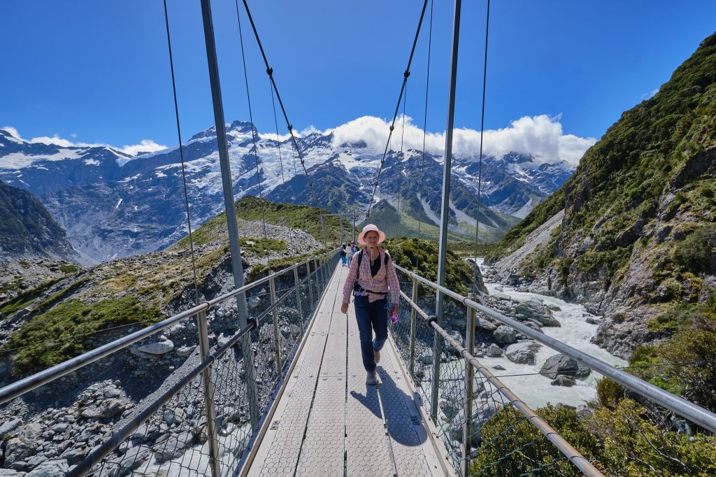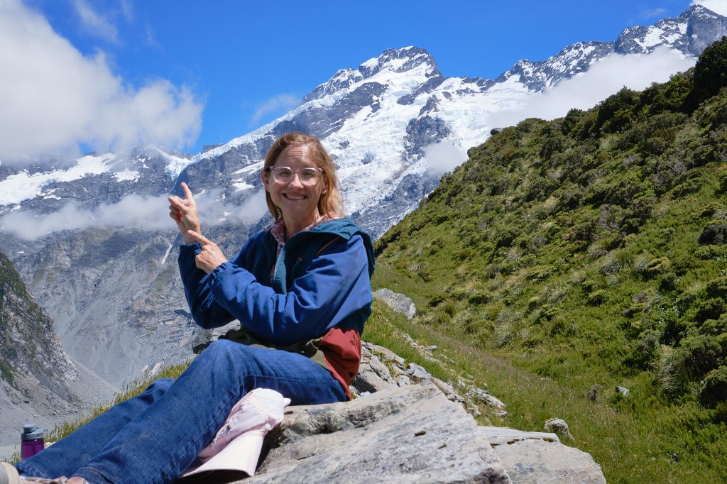 Our first suspension bridge was an experience. Over rushing waters of pale sage green it lead to the first of several glacial lakes. An exclamation point sign very clearly stated a limit of 20 people. But more than that were crossing. As we approached the bridge a woman very politely asked us if we could please wait. Her husband was on the other side of the bridge and was feeling extremely nervous about crossing with so many people. Could we wait until he was able to cross alone? Of course, we said. So we waited. And waited. A line formed behind us. Still no sign of him. Finally a hiker suggested perhaps she should cross with him. It might make him feel better. And the hiker promptly passed the woman onto the bridge. We followed. The bridge did wobble a lot! And I get it: anxiety isn’t an easy thing to deal with, especially over a roaring river. But it also felt very secure. The bridge wasn’t going anywhere. I hope the husband made it across OK.