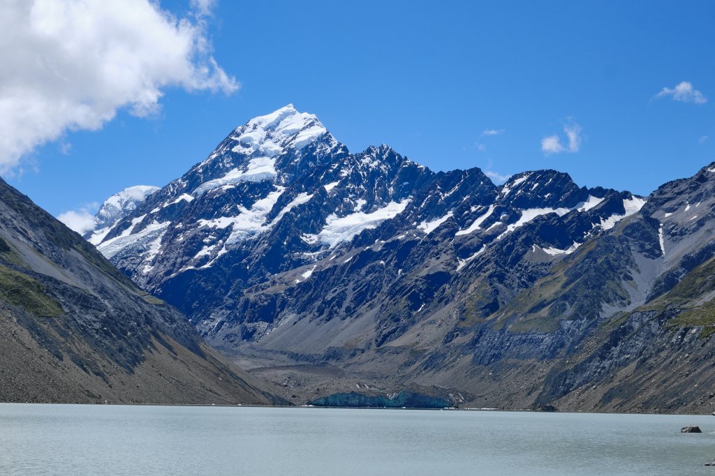 It wasn’t until we crossed the second suspension bridge that we saw IT: Aoraki, Mount Cook, the tallest peak in all of New Zealand. And it was STUNNING. Turns out that that other peak, was just a teaser! Two snow covered peaks filled the perfect bright blue sky. Snow melted into narrow waterfalls against rock of black and dark gray. Mike has taken lots of wonderful pictures. But being there was an un-capturable, breathtaking experience.