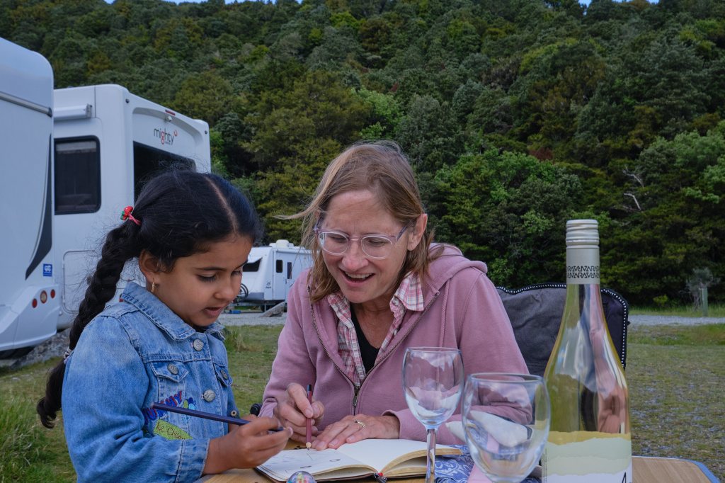 A nap, a dinner of 2 Minute Noodles (as Ramen is called here) and smoked salmon and we noticed a familiar big pink bus. We’d seen it at our Akaroa Holiday Park. The family and I did laundry together. The adorable little girl recognized me. Soon she was at our picnic table with her father and we were all chatting. Mawaba is 5 years old. We drew a picture together. Her parents and big brothers emigrated from Iraq 14 years ago and her dad refurbished the pink bus himself. They travel this way every year.