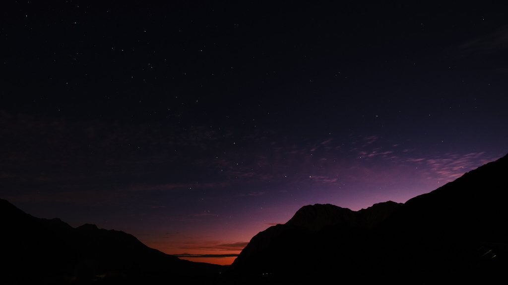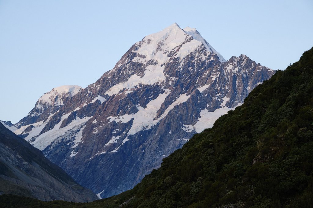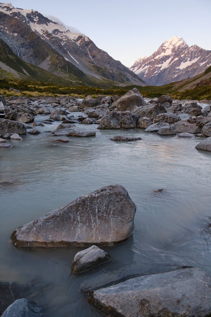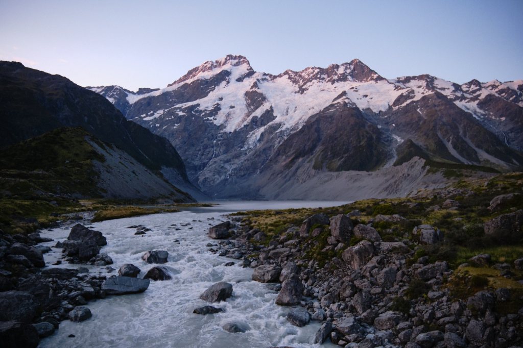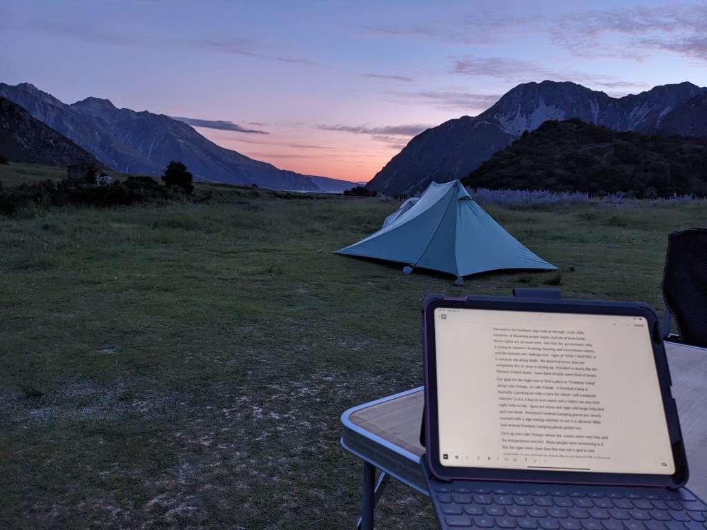 The sun was setting and Mike had a picture of Mount Cook in mind. So we set off up the Hoover Valley Track again! I turned back just after the first bridge, but he walk to the second and got a great shot! It was almost dark when he returned to find me sitting outside, watching the fading pink sky, with a cup of warm Milo (like Ovaltine) and this iPad, writing the two-days-ago post.