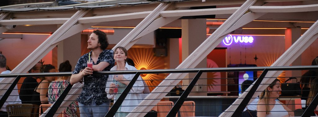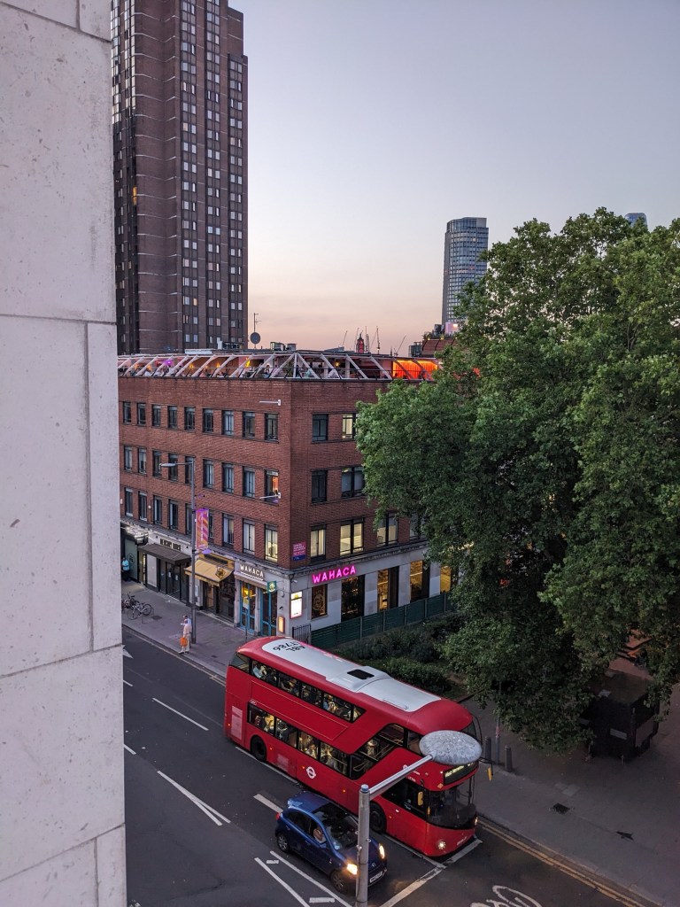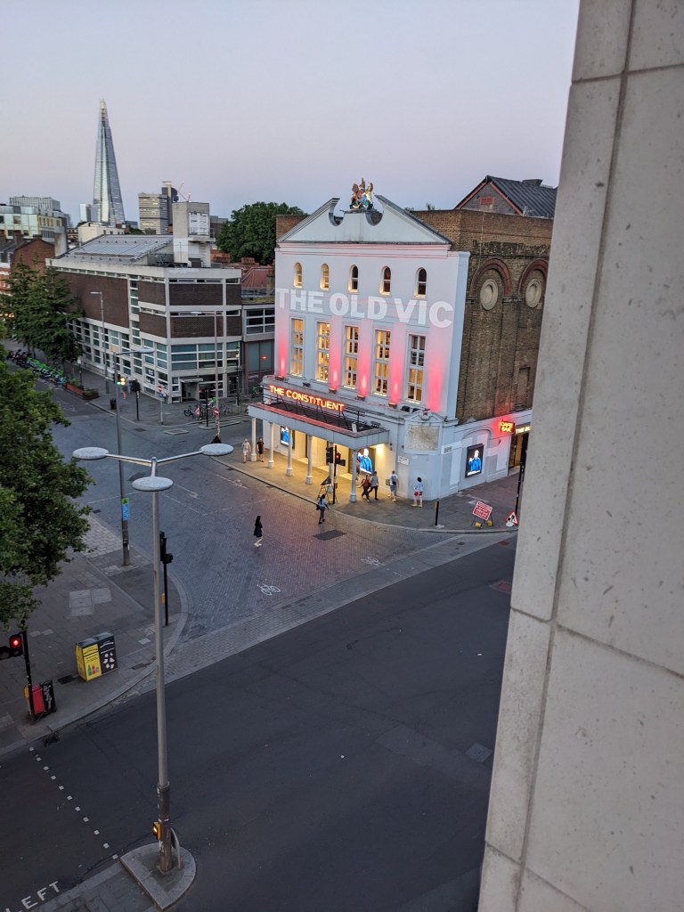 At 9pm patrons streamed out of The Old Vic, the end of a play starring James Corden. Emi and David decided to check out the roof top bar across the street. We waved to them from our balcony.