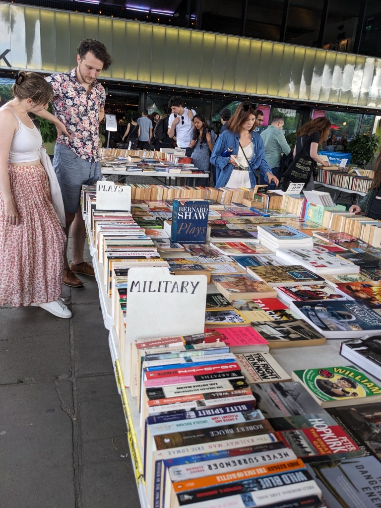 And it was hopping! Throngs of people, performers, music, food. Under a bridge we were thrilled to find a huge used book sale! No better place for us to start. Emi and David looked through the section of plays. Ben and Mike picked up some copies of the Just William stories we love so much. I looked through some elementary school primers, and bought some vintage post cards.