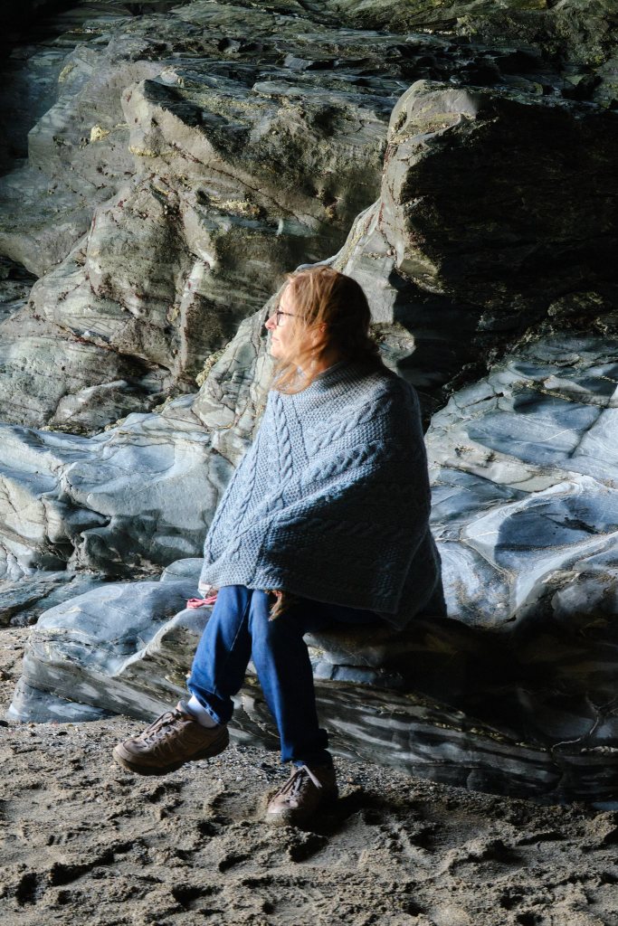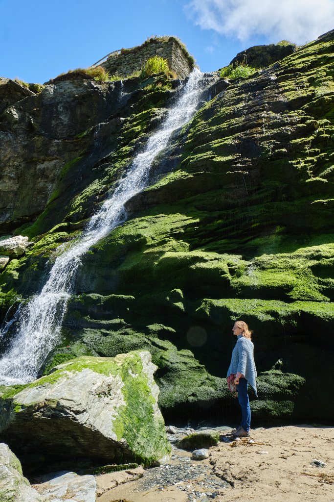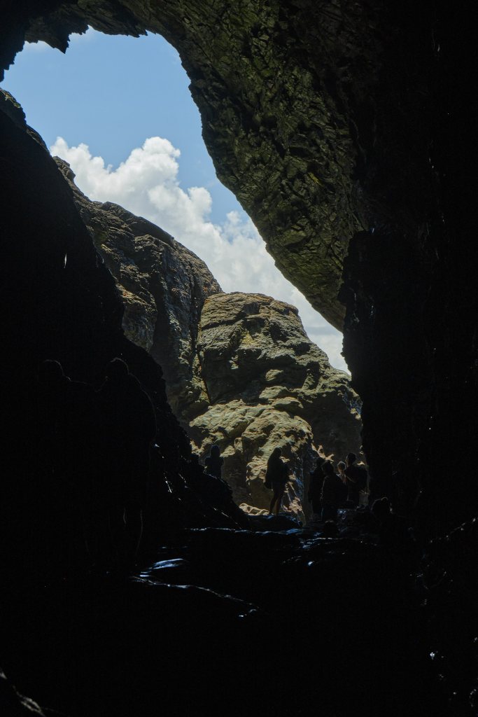 Having paid our admission anyway, we followed the crowd down to the cafe, and ate our lunch with a beautiful view of steep cliffs and sparkling blue water. It was low tide so we would be able to go down to the beach and into Merlin’s Cave. It was a very cool beach. Difficult to get to, as steps have been damaged by the tides, but this, at least was worth the effort. Fresh water falls from high above and into the sea. Kelp in a vivid shade of pink hugs the water line. Stones sparkle like mirrors. The cave is large and creepy and the more adventurous were braving uncertain currents to walk through to the other side. Rocks worn by eons of water were worn smooth into seat-like shapes. OK, I can see that Merlin would have liked performing magic here. At low tide, at least.