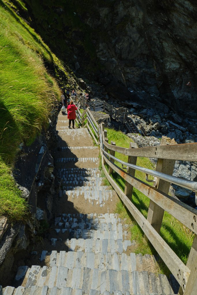 We parked, I almost got hit by careless driver pulling out, and we went to the Tintagel Visitors Center to buy our tickets. Too late I asked “So what makes this site related to King Arthur?” Blandly, the bored woman behind the counter replied “King Arthur is a legend. There’s nothing historical about him”. Strike 1.
