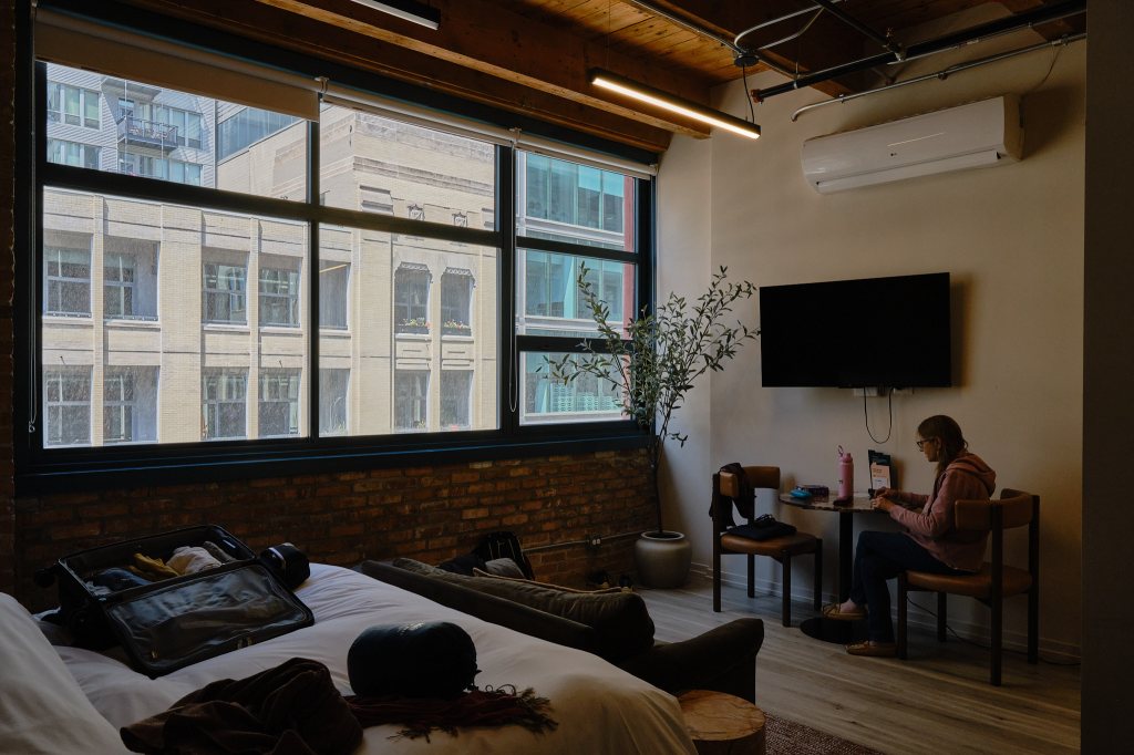 We found our studio apartment to be warm, bright and cozy. The building is likely an old converted factory, the walls are old brick, the ceiling beams reclaimed wood with countless little holes, nails and dents. This building has seen some things.