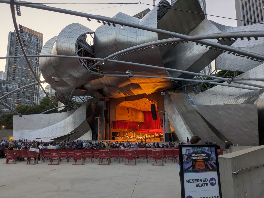 A quick nap, dinner, a walk to the river with its countless iron bridges, and on to Millennium Park, where we had tickets to the Grant Park Symphony, the “house band” of The Jay Pritzker Pavilion.