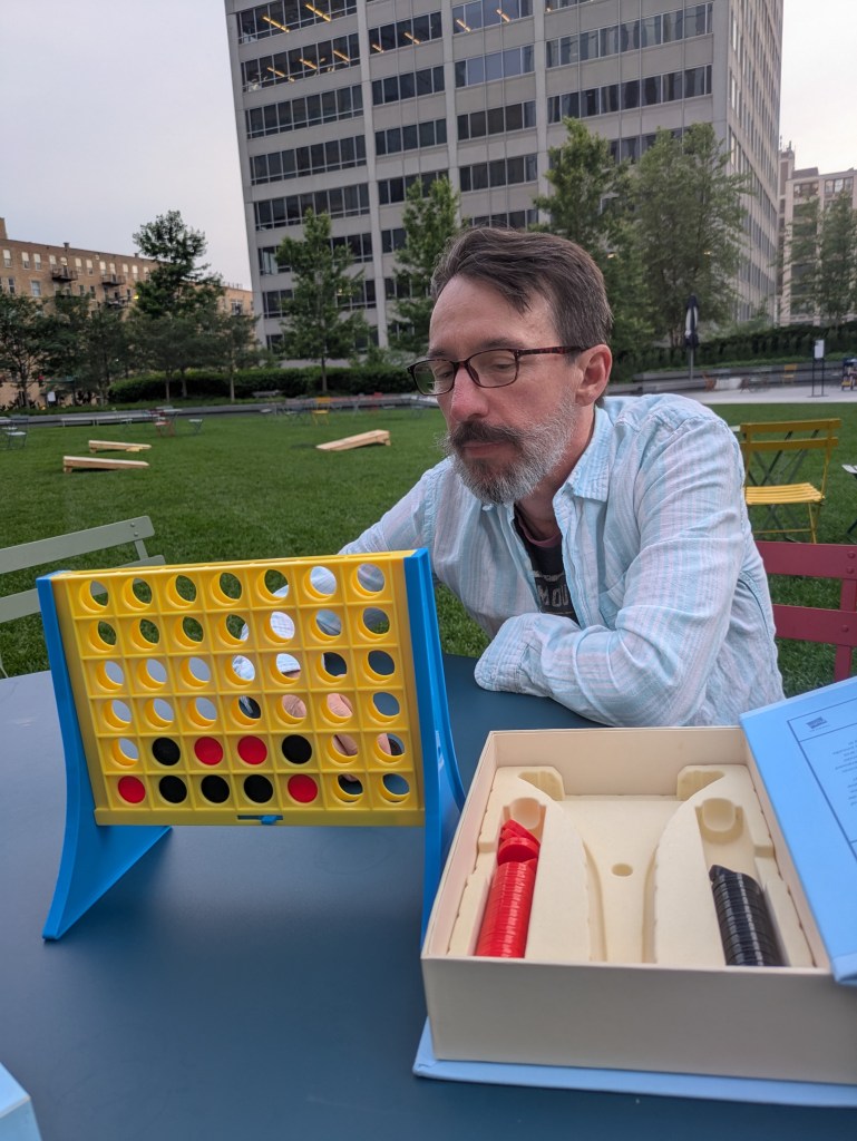 We ordered to-go and ate at a, in my opinion, hidden gem of the city: The Green at Canal Street. This oval courtyard has little tables and chairs on an impeccable manicured lawn. It was quiet. There was a cart filled with board games. Fearing the breeze would blow away the cards from The Dating Game, we took out Connect Four and played a few rounds. Another cart was filled with books. We’d just missed an open poetry reading (sigh!) so instead, read a few pieces aloud each other. A lovely end to a lovely day.