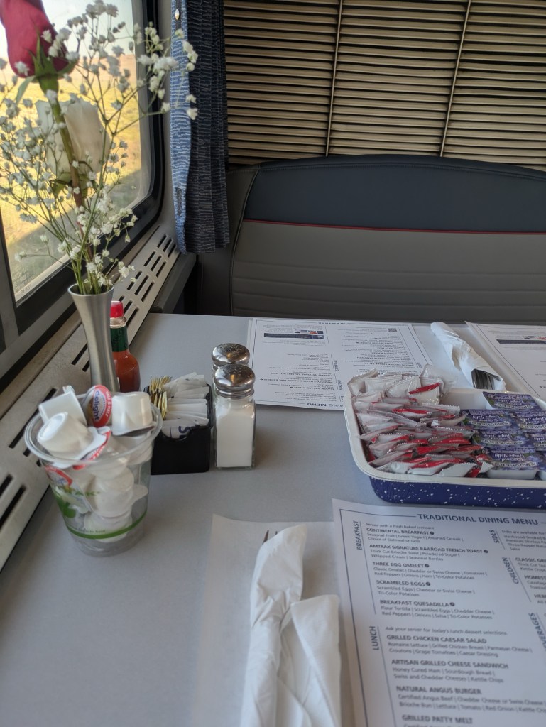 Dining: For everyone in roomettes and sleeper rooms, breakfast, lunch and dinner were all included. For this trip that meant dinner on Tuesday, three meals on Wednesday, breakfast and lunch on Thursday.