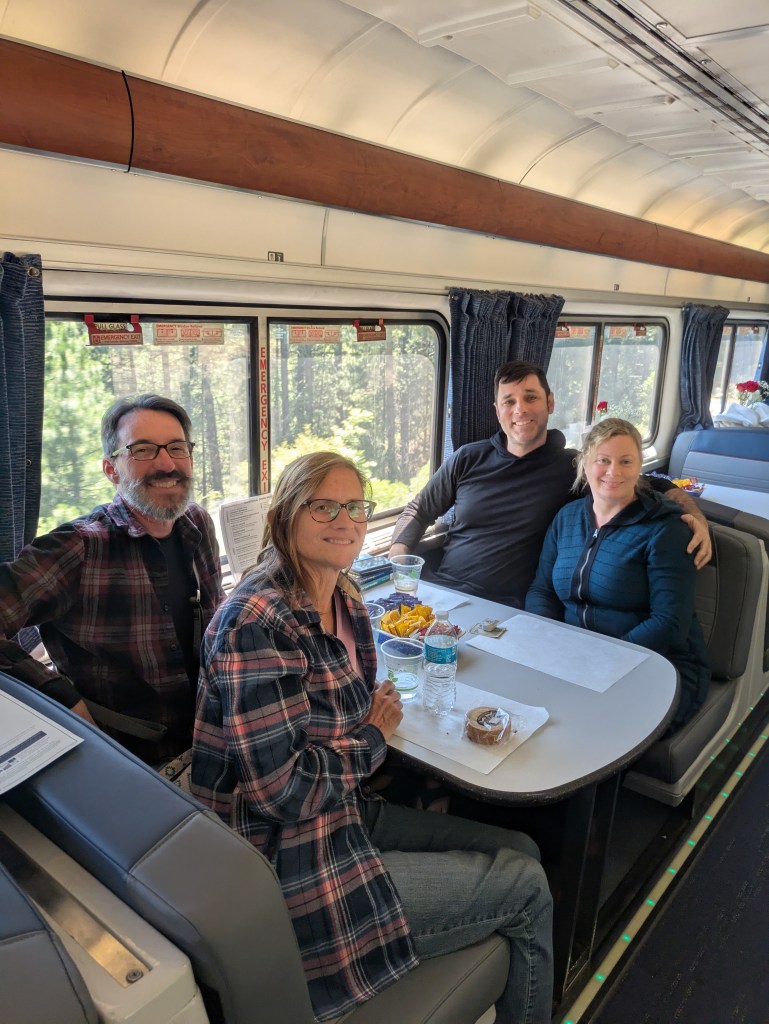 Observation Car: Atop the cafe the car has large windows along the walls and ceiling. It has seats on one half, booths on the other. It was always full. It was usually noise with kids playing card games and people chatting. One found a spot using the phrases “Is this seat taken?” And “would you mind moving over one?” “Thank you so much!” “SO where are you heading?” “How are you enjoying the trip?” Generally people were pretty good about staying only an hour or two, but we do think the conductors could have encouraged that a bit more.