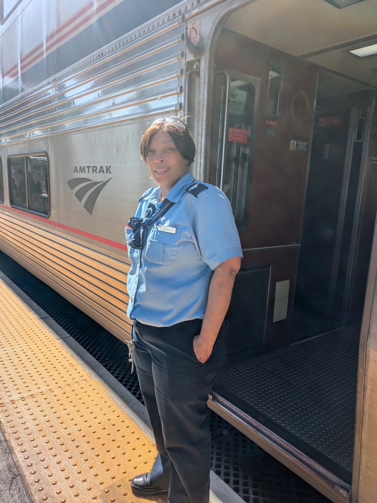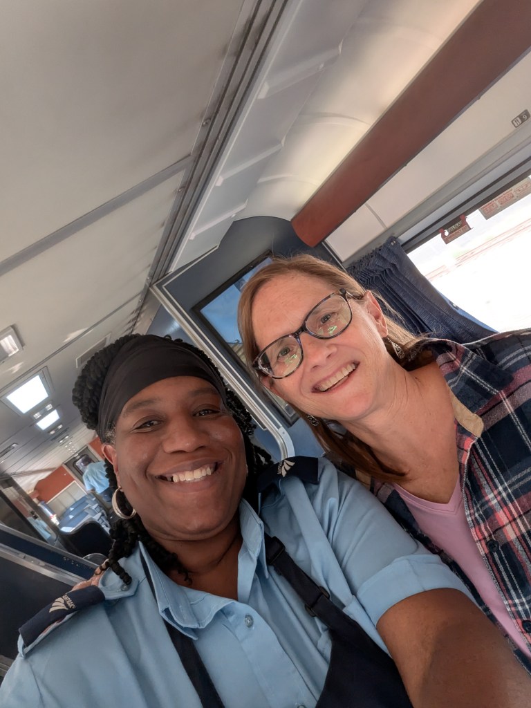 Tanika, our car attendant worked so very hard. She turned seats into beds and beds into seats. Constantly cleaned the car bathrooms and the one “public” shower (and on the intercom pleaded with us all to not leave a mess in them). She announced when a train stop would give us enough time to get some fresh air, and how the smokers could prevent forest fires. She was out on every platform, greeting us as we got off and on, and signaling when the train was about to move on. Tanika set up rooms for new passengers after others got off. Took care of room service, actually packing and delivering complete meals to those of us who decided to eat in. The A/C for the roomettes broke (leaving some passengers sweltering) and she arranged special seats for them in The Observation Car. And when a woman in our car had a medical emergency in the middle of the night, Tanika coordinated with train staff and the Salt Lake City EMS to make sure she got to the hospital (that caused a two hour delay, but no one we spoke seemed to mind much). She did this for all three days of the trip, would get one night in a hotel, and then do it for the three day return trip. And she was ALWAYS nice! When did the woman sleep?!