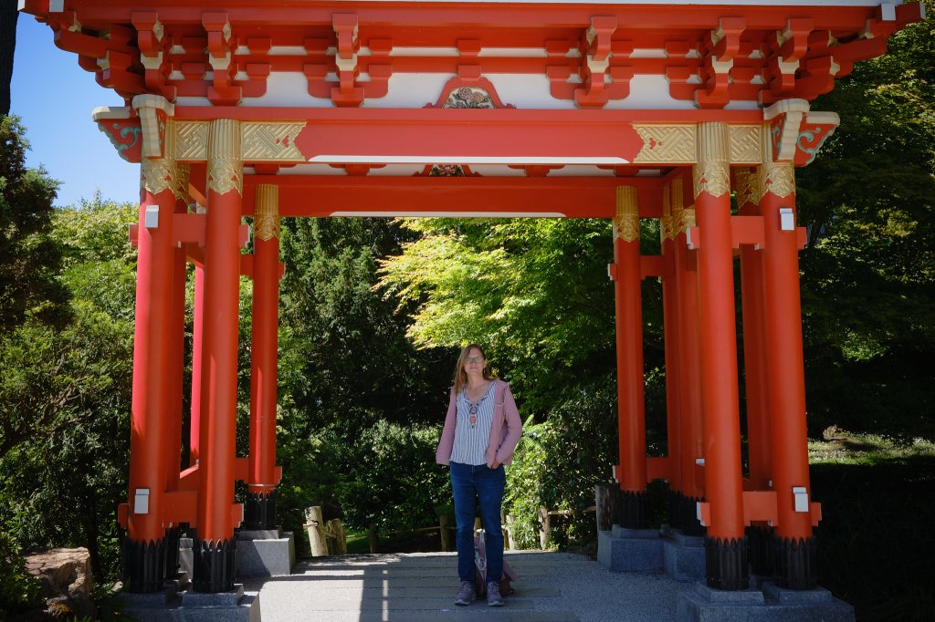 Taking a table at the tea house we sipped hot sencha and genmaicha while enjoying the sunshine. We wandered through pagodas, down curving paths, across a stream filled with coy, and climbed a rainbow bridge. A mother and daughter from Arkansas (such lovely accents!) chatted with us about travel and photography (we always have great conversations with people carrying cool cameras!)