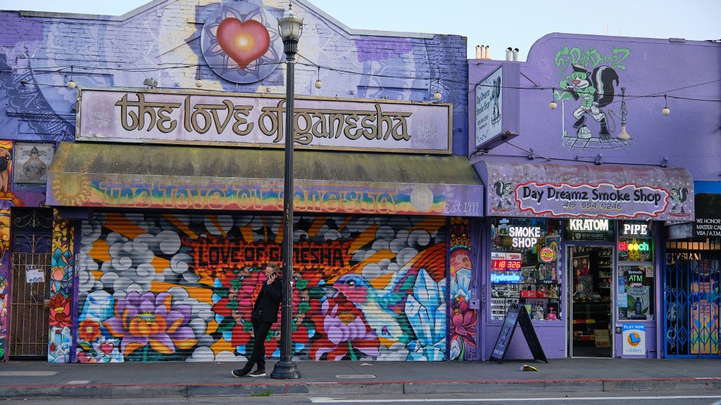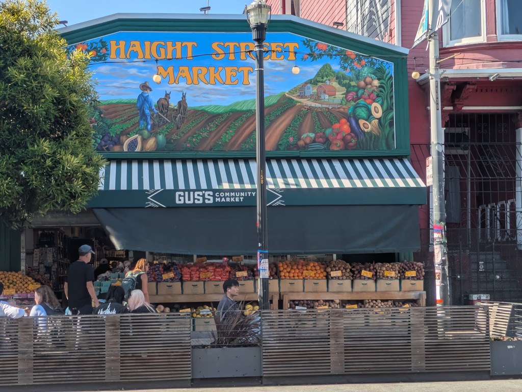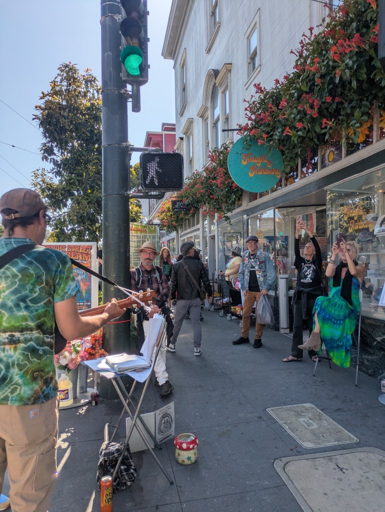 It was late afternoon and Haight Street was hopping. Music was being played in bars and on corners. The scent of patouli filled the air. Walls have been painted in rainbow hues. A local artist showed us his work, views of San Francisco in bright colors and shapes. There were several shops selling bright and flamboyant costumes (for drag, maybe?). I counted four, yes four, stores selling clothing and gifts from Nepal. And I am convinced that a large majority of vintage clothing in the country ends up right here.