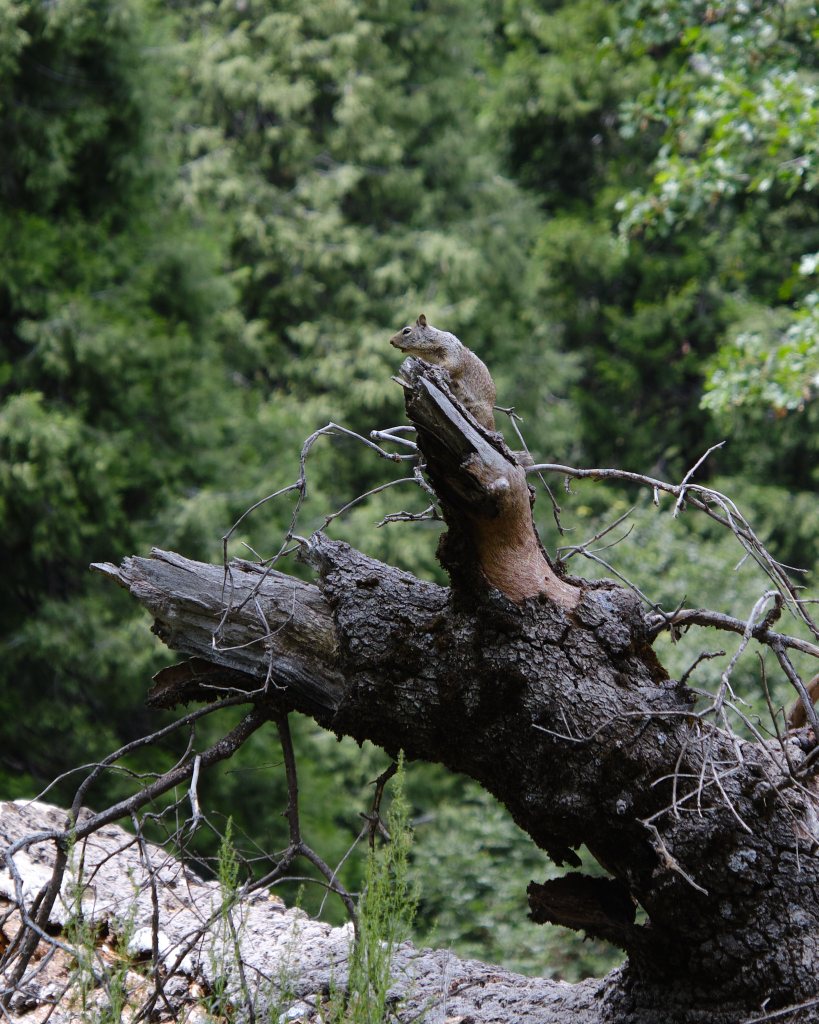 We enjoyed walking up the path with other visitors, then sitting down on a shady rock to eat our packed lunch. A ground squirrel came out from under a log and begged for crumbs. She was very bold and very cute. Unlike the squirrels at home who live in trees, these squirrels have squat bodies and thin tails. They crawl more than hop, and rarely climb high into the trees (the flying squirrels do that. Wish we had seen one!). Signs of DO NOT FEED THE WILDLIFE abound. But squirrels can’t read. Mike tossed pinecones to shoo them away.