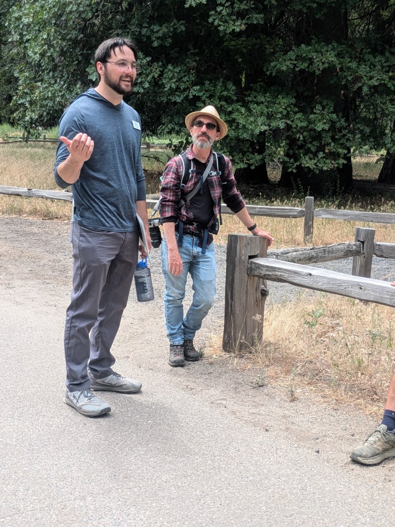 At the base of Yosemite Falls the weather turned dark and cool. It began to rain. Thunder rumbled. When I suggested that perhaps we ought to seek shelter, I was brushed off as an “East Coaster” (again!) and was told that thunder rarely hit inside the valley. None of the tourists seemed too bothered either. So in the rain the class continued through meadows, down paths, across a bridge. I was so cold that when we unexpectedly found ourselves at our primo parking space, I gratefully grabbed my cloak out of the car. Ahhh, warmth.