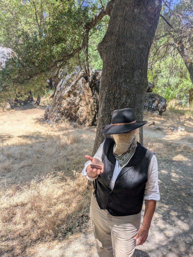 Out of the woods came the notorious Calamity Karen! The stage coach came to a stop. She moseyed up to our windows, saying we “looked mighty familiar”. We thought the same. Other than the bandanna over her face, she bore a striking resemblance to the woman we saw standing outside the stage coach office. Calamity Karen was looking for valuables. Fortunately Mike found some gold wrapped dark chocolate in his pack, with which were able to bargain for our lives. A piece of the chocolate was all it took to get us safely on our way again. We laughed all the way back to town.