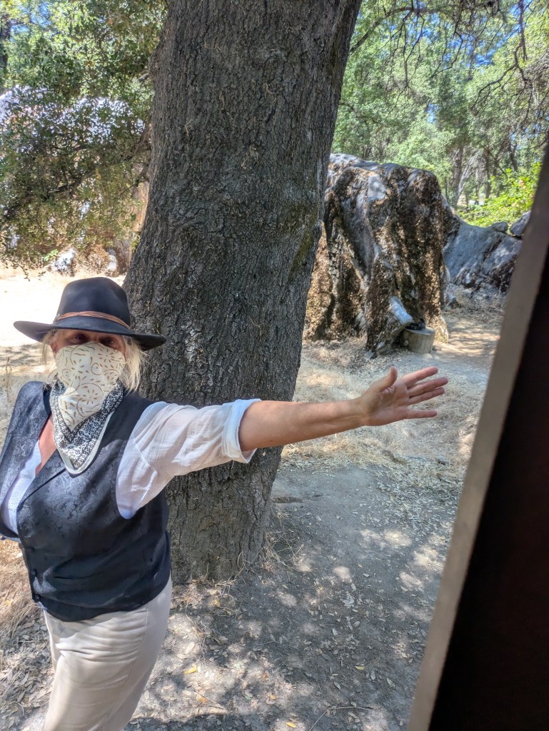 Back on Main Street, it seemed like we weren’t strangers anymore. Locals, costumed and not, talked to us. The guy in the ice cream parlor was especially nice. He was excited about tonight’s opening of The Wizard of Oz, by Sierra Rep. Two mothers chatted on a bench while their children ate lunch at the pizza parlor a few blocks away. We applauded her patience as she spoke to her son on the phone instructing him on how to order a pizza “You go inside and you order a pizza”, she repeated four times. He just wasn’t getting it. Still, she told us how she just moved back here from the city and loved it. Another family lounged on the rocks that had been uncovered in the search for gold. The town used to be ten feet higher, their mother told us. They all loved coming here. We even spoke to Calamity Karen’s “twin”.