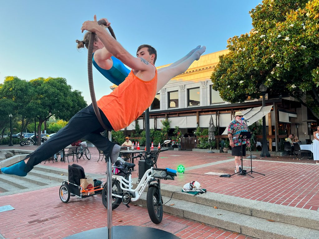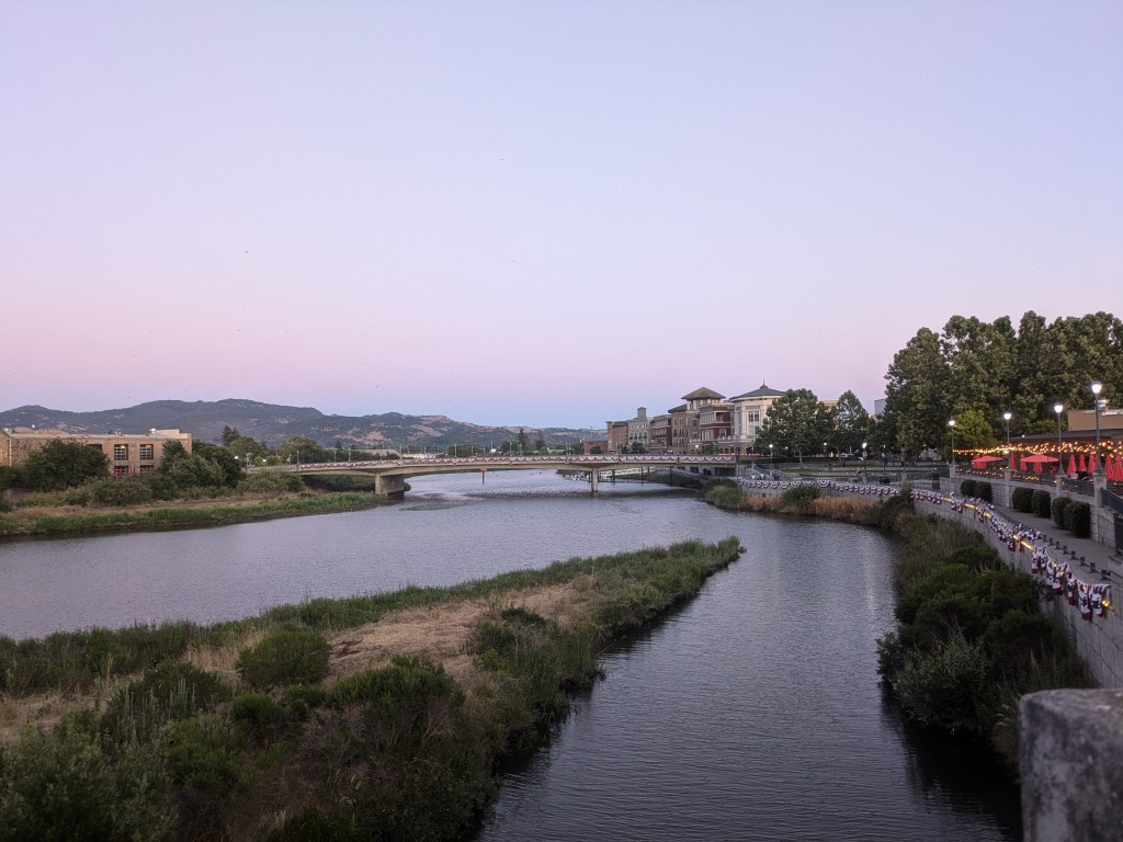 We opted instead for an early dinner in downtown Napa. We ate a great wood fired pizza and talked to the cheery local staff. Main Street was hopping. A guy singing Frank Sinatra karaoke accompanied acrobats balancing on a spinning ring. Mike took me in his arms and we danced. Wonderful. We watched flying swifts eat insects and bed down for the night over the Napa river, and saw many groups of partying “wine girls”.