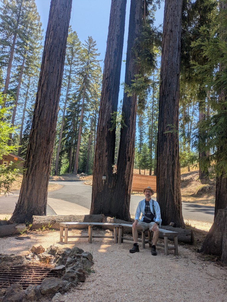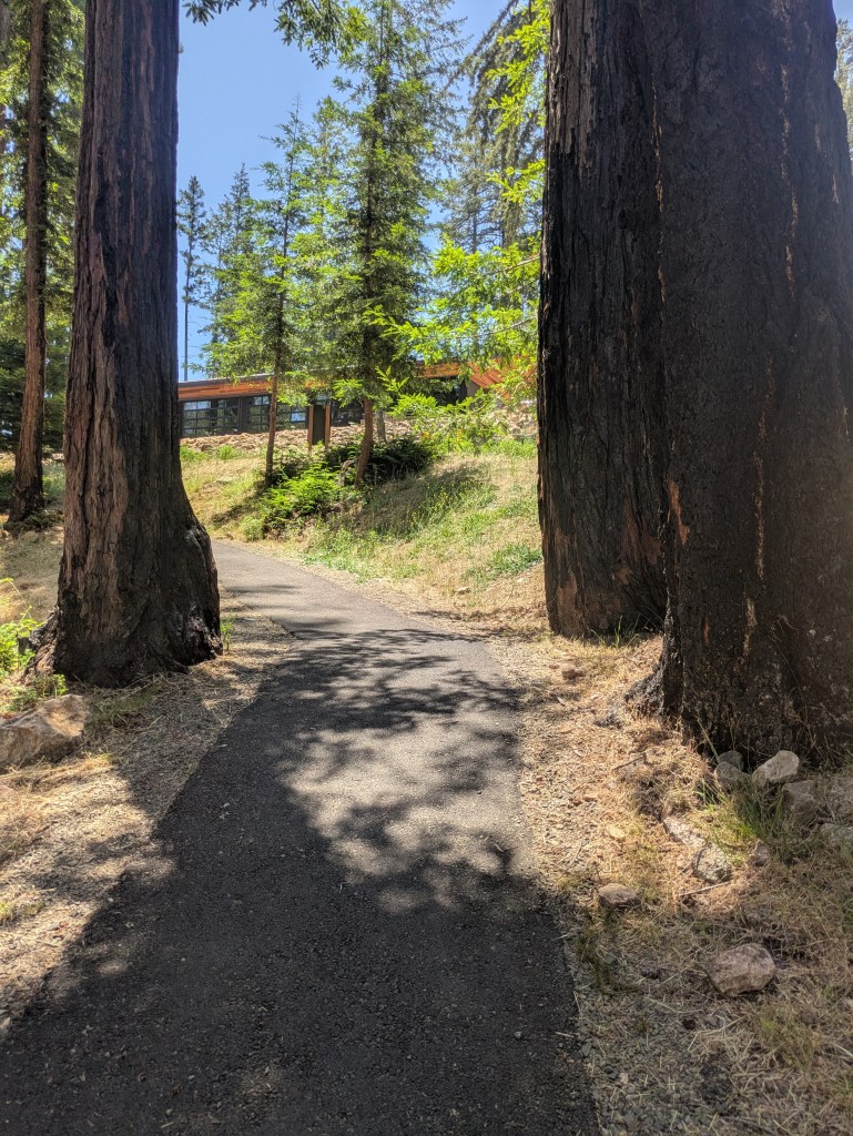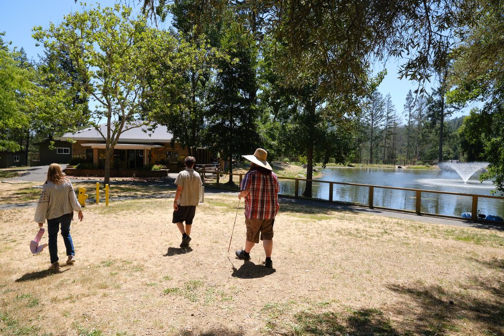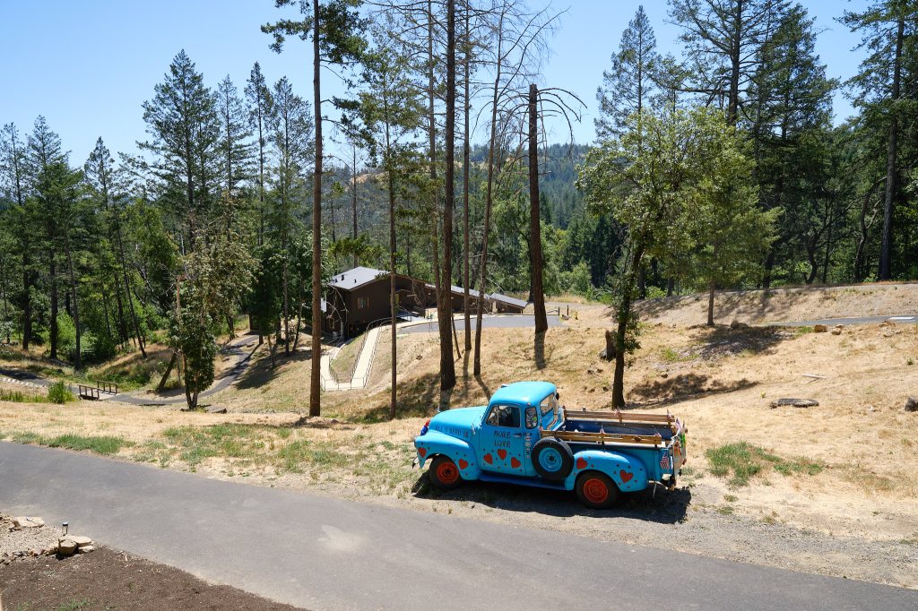 And then it was time for what we had come to Napa for: our visit to Enchanted Hills Camp. Up out of town and onto Mount Veeder Road, which I was so familiar with once upon a time. The vineyards we passed looked the same, as did the twists and turns, but the wildfires of 2018 were apparent. There were a lot less trees.