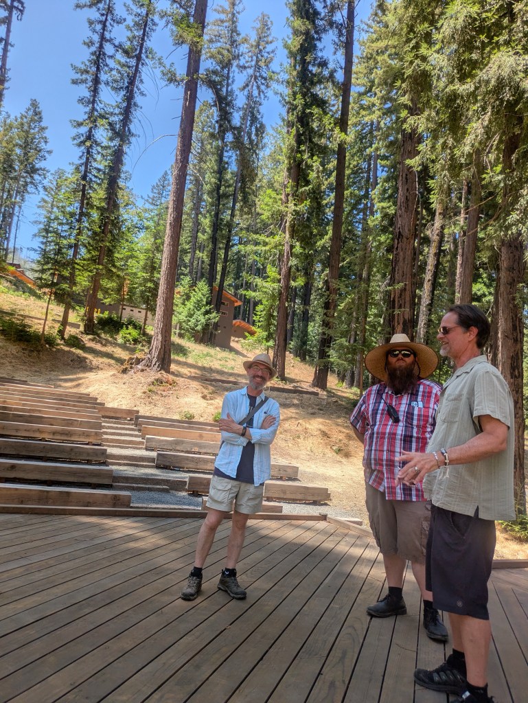 We continued on to the fire circle, now in an amphitheater shape. To a red wood circle both Mike and I remembered well. The bark of the trees are now black like charcoal. Tony and Jamey took us to the old chapel, the most sacred place I have ever been. Redwoods, a trickling stream, wooden benches. We used to hold Sunday services there. Now they hold singing and mediation sessions. I sat and cried. The chapel was restored so well it looked not one bit different.