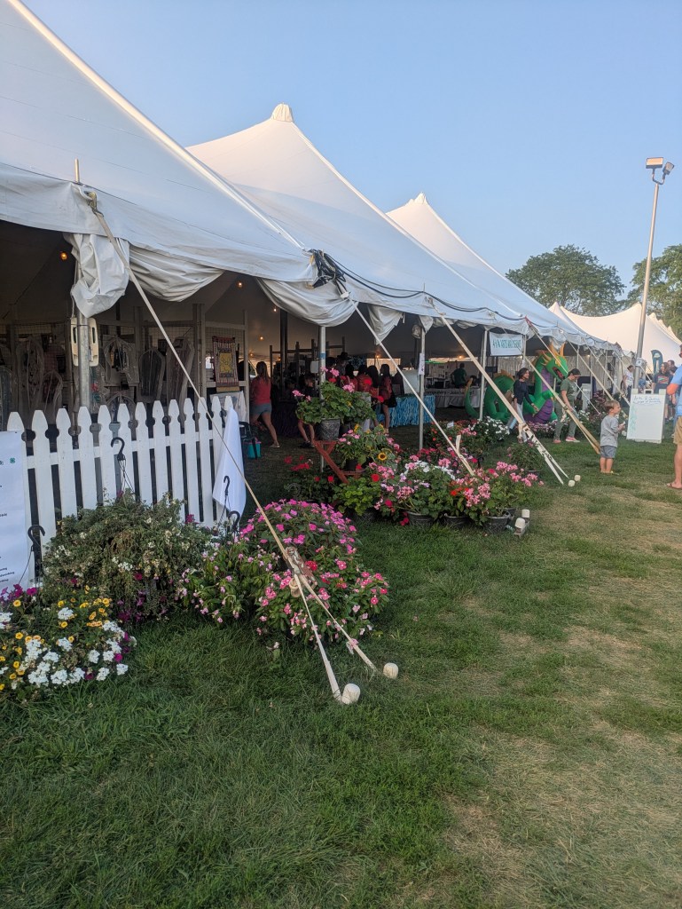 And then the plants arrived. Hionis Greenhouses, a local wholesale nursery donates flowers to decorate our tent. And not just a rack or two: but an entire cargo truck and a half! Hundreds of colorful, beautiful potted flowers. Racks and racks come off the truck. Myself and volunteers take every plant off and into the tent. Supervisors from other tents arrive: “Can we take some?” Me; “ Of course! Please take MORE!” And for the rest of the afternoon we place the flowers in and around our tents.